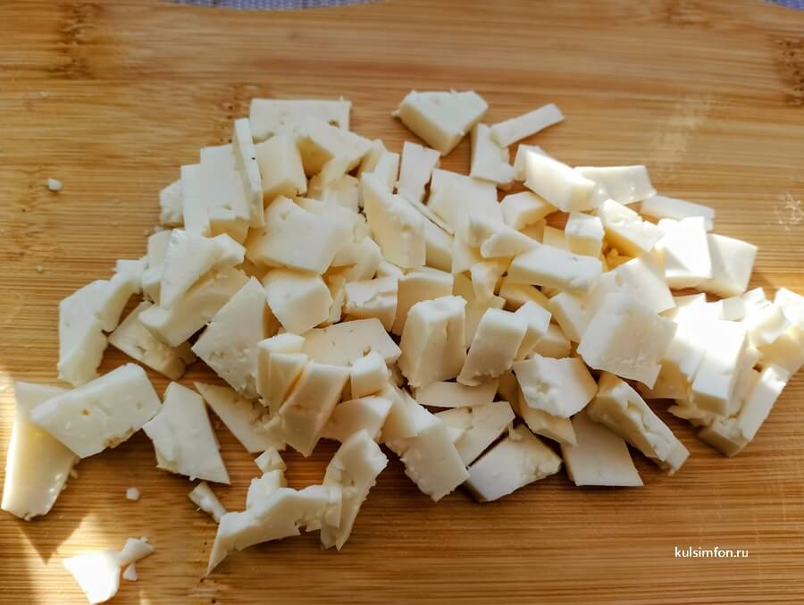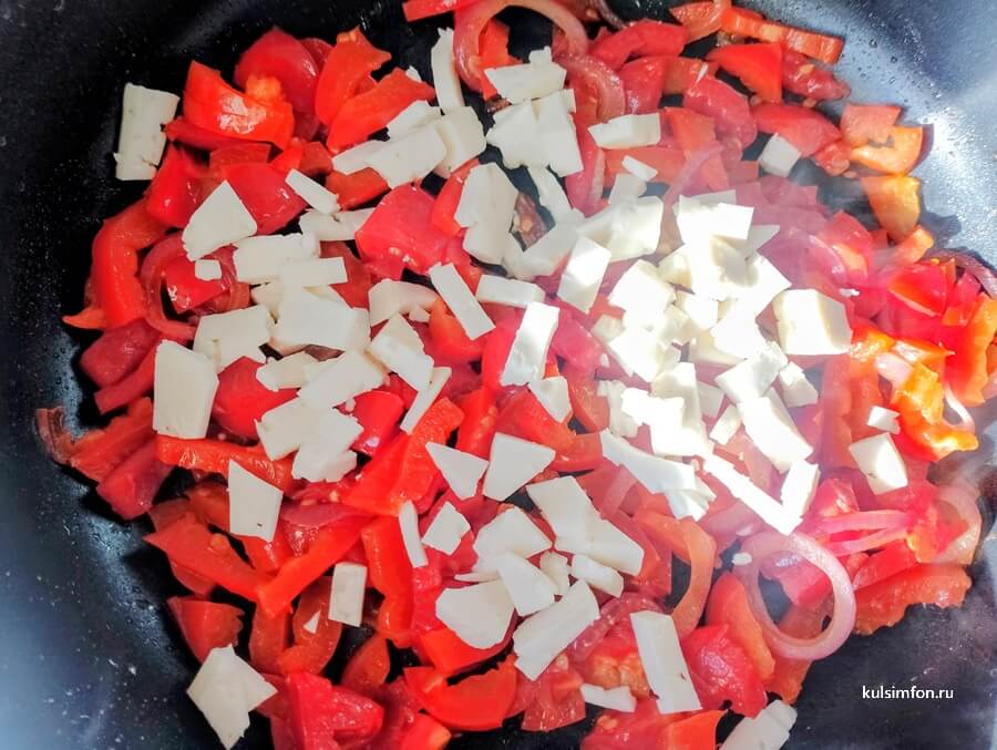 - Брынзу нарежьте кубиками или раскрошите вручную. Добавьте к овощам и перемешайте.