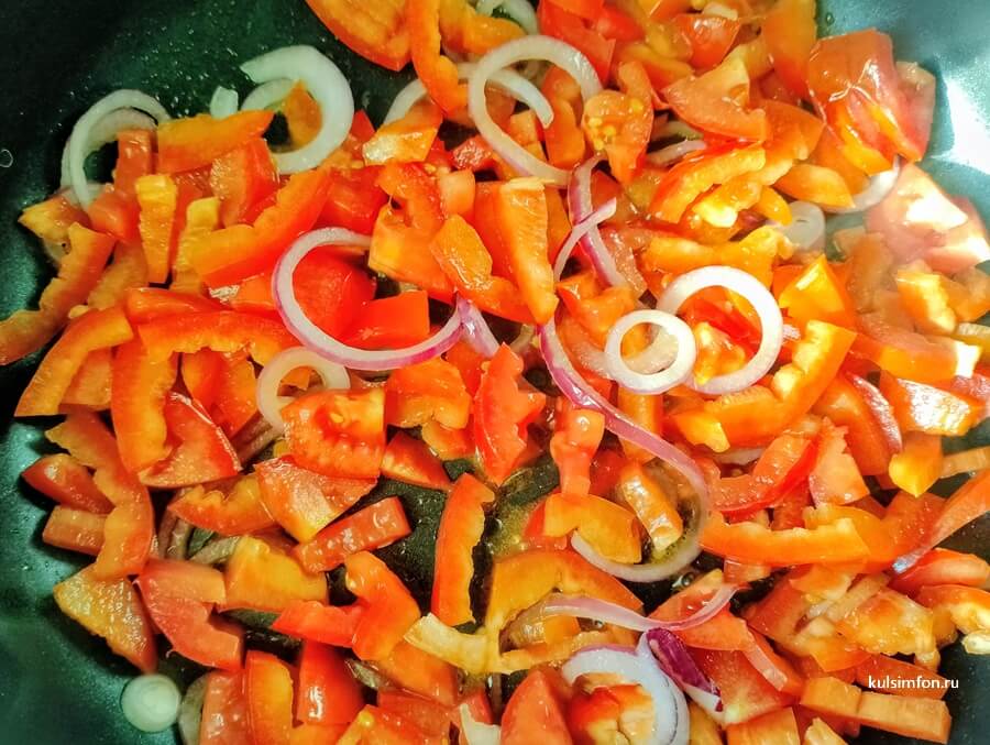 - Разогрейте масло на сковороде, выложите лук и помидоры, обжарьте до мягкости.
