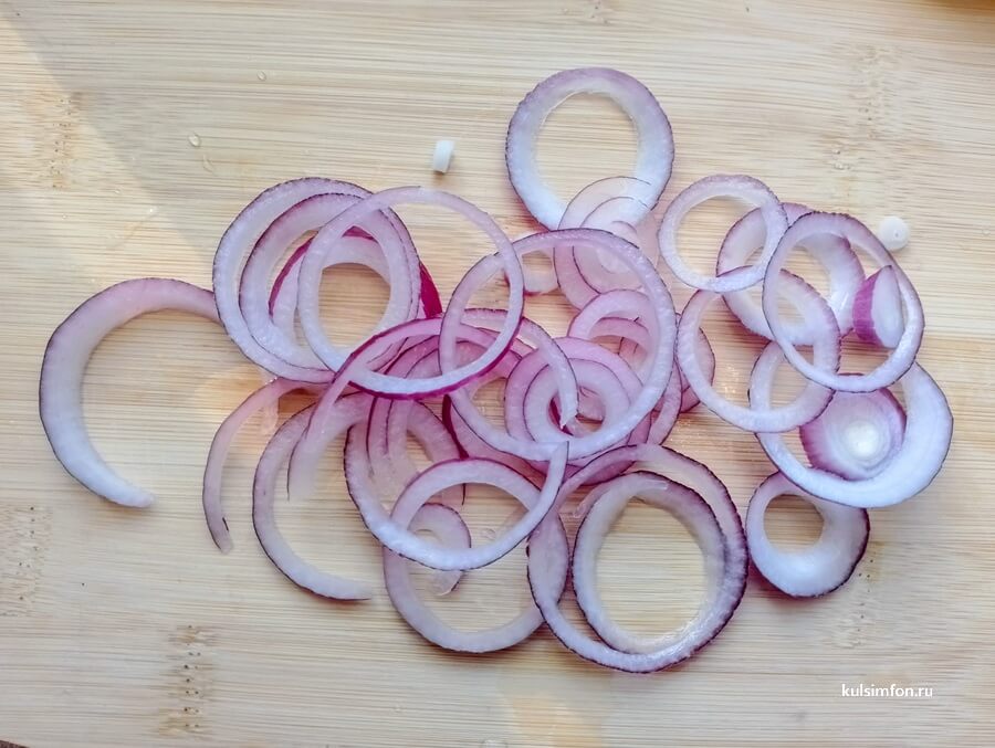 - Очистите лук и нарежьте его тонкими кольцами.