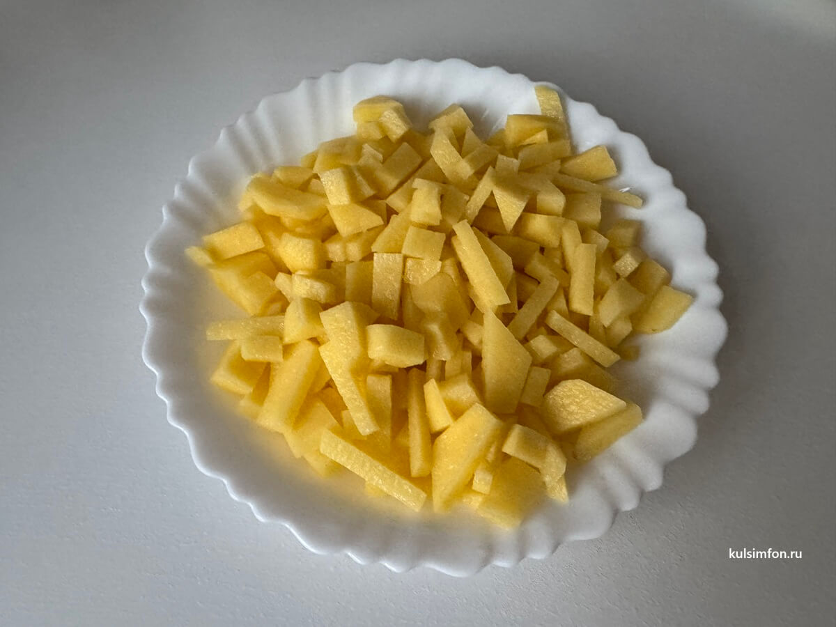 - Картофель очистите, нарежьте кубиками и добавьте в кипящий бульон. Варите 10 минут.