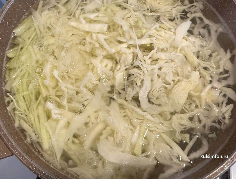 - Капусту тонко нашинкуйте и отправьте в кастрюлю.