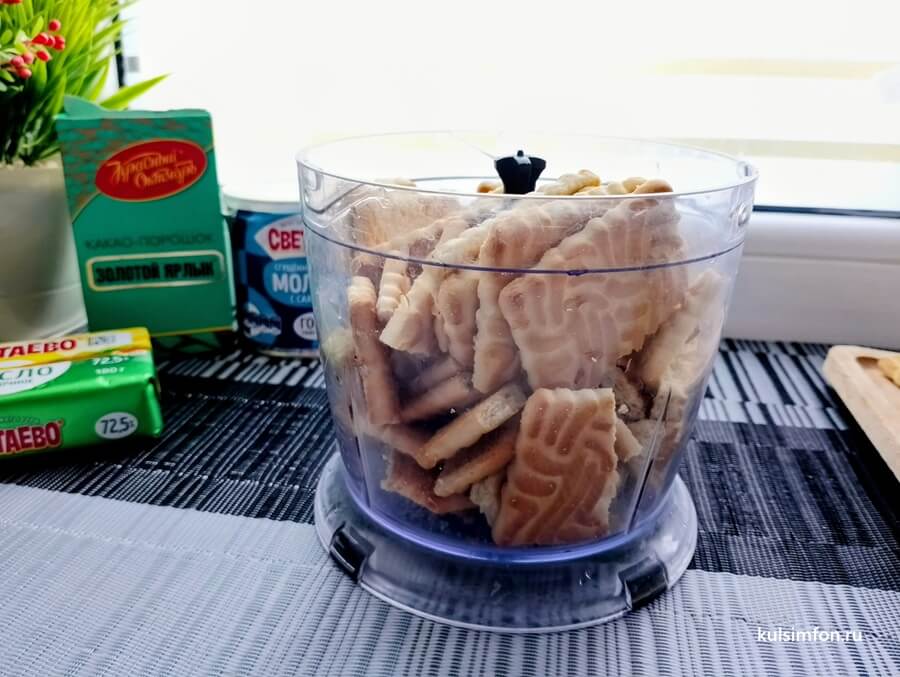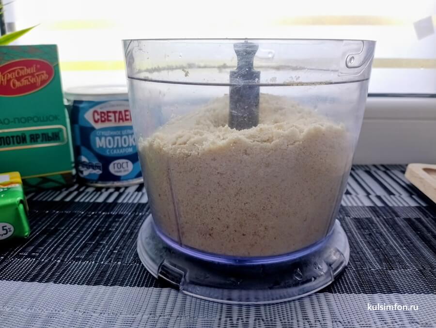 - Измельчить печенье до состояния мелкой крошки.