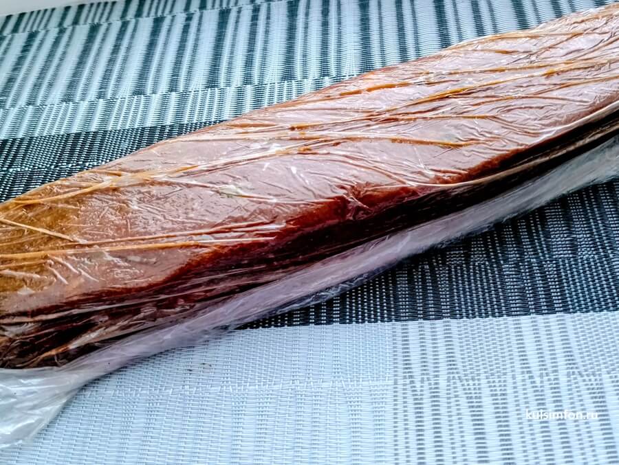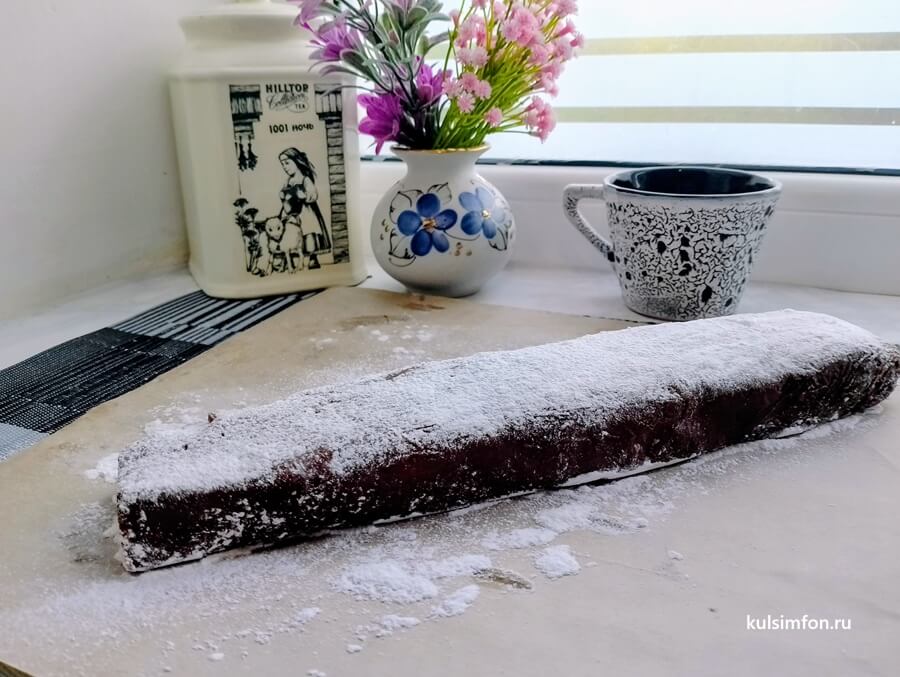 - Сформировать из массы колбаску нужного размера. Готовую кондитерскую колбаску завернуть в пищевую пленку и убрать в холодильник на несколько часов до полного застывания.