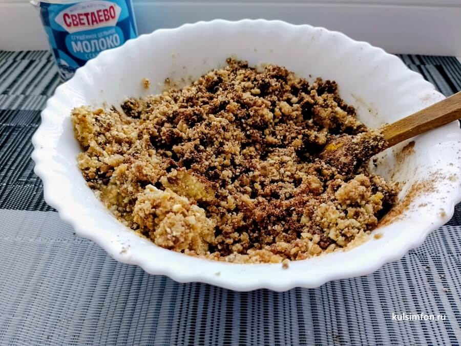 - Сливочное масло растопить и влить в сухую смесь, тщательно перемешать до однородности.