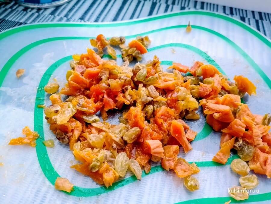 - Курагу обсушить и нарезать небольшими кусочками, примерно по размеру изюма.