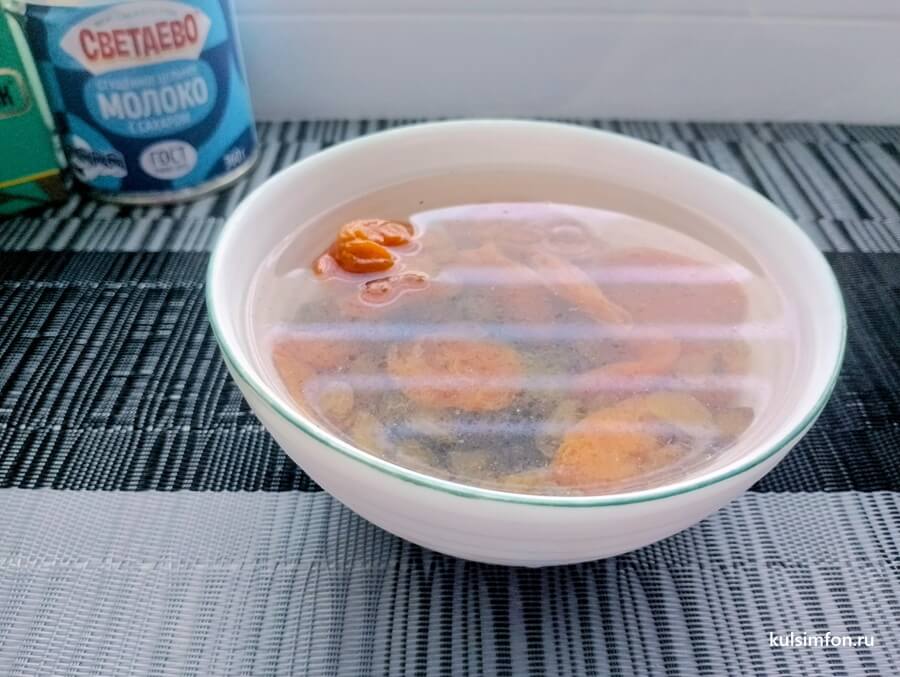 - Курагу и изюм промыть, залить кипятком и оставить на 15–20 минут, чтобы сухофрукты стали мягкими.