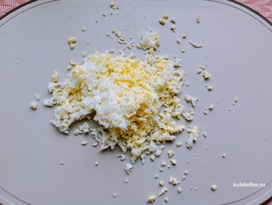 - Отварное яйцо разомните вилкой в крошку или натрите.