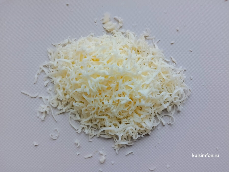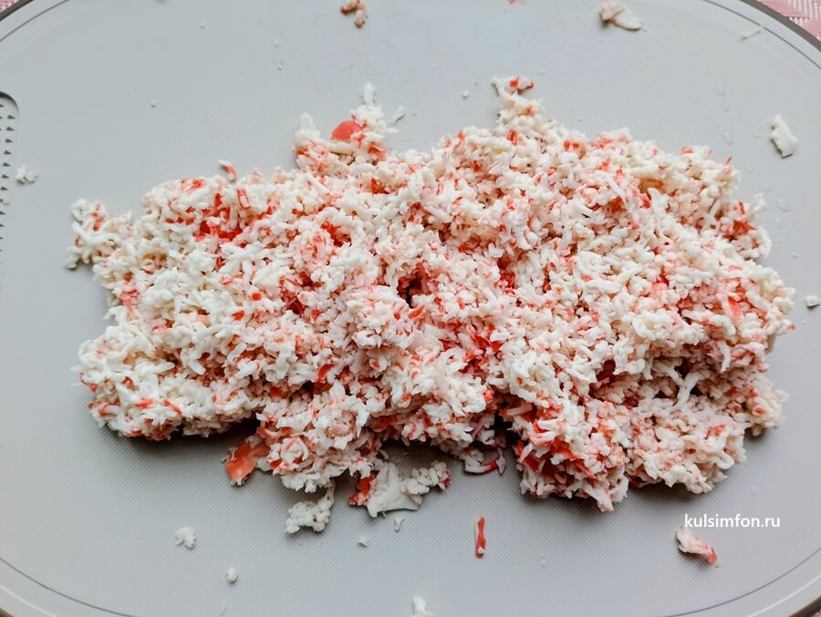 - Крабовые палочки натрите на терке. Если они влажные, слегка отожмите массу руками.