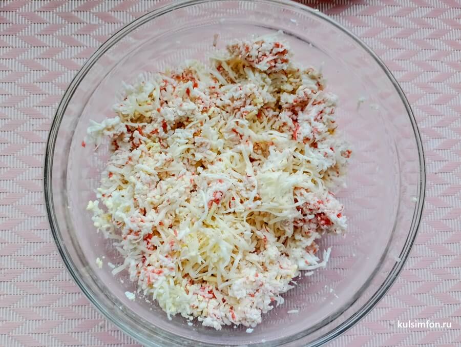 - Смешайте в глубокой миске сыр, крабовые палочки и отварное яйцо.