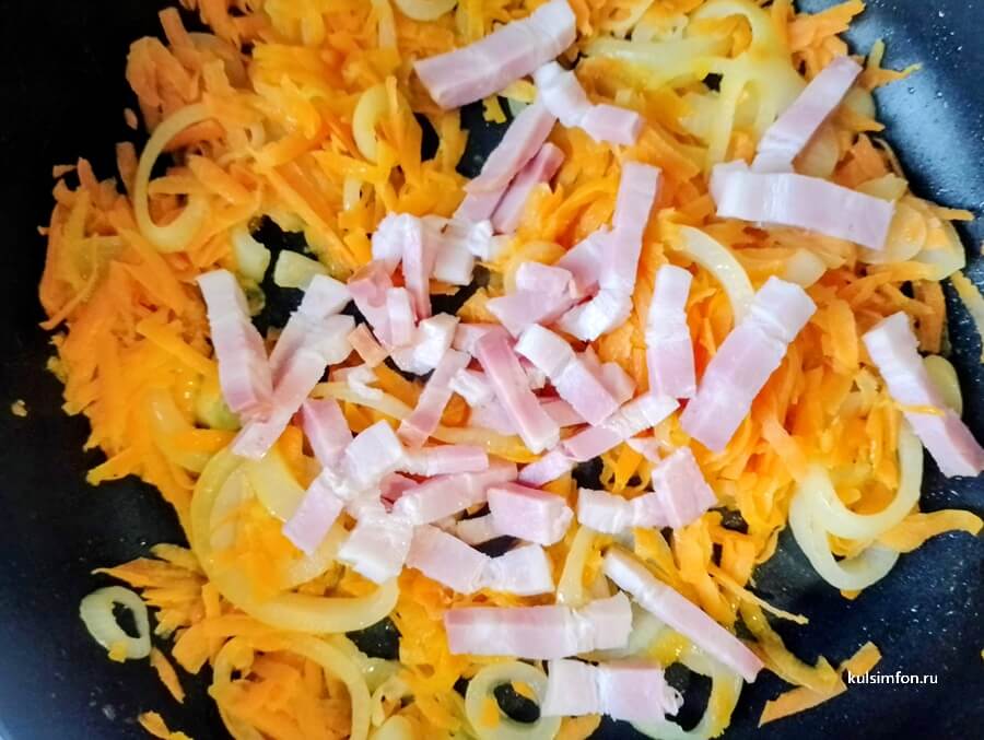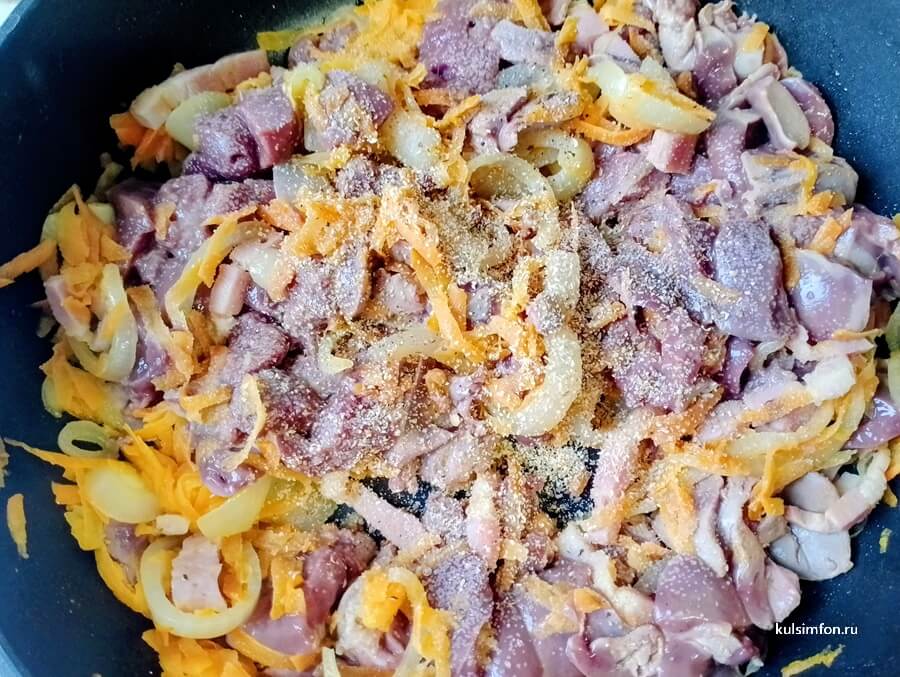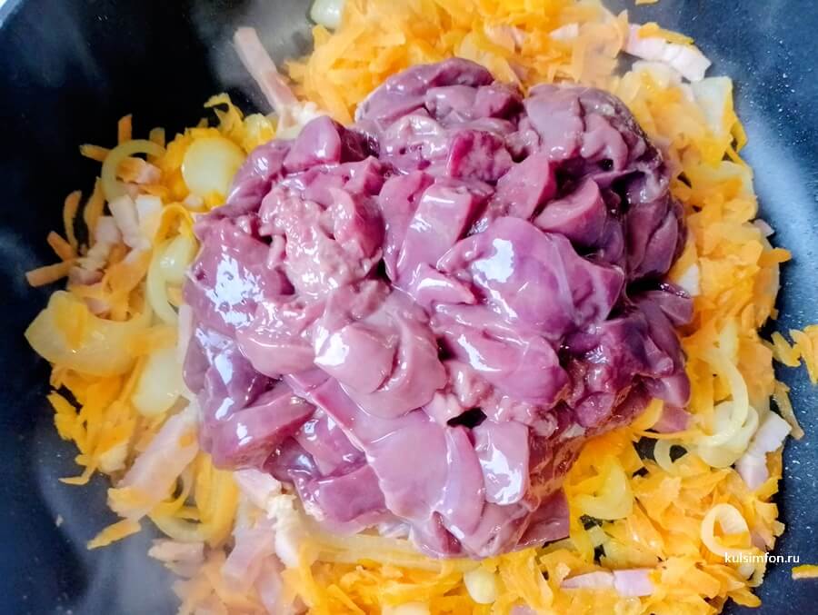 - Добавляем печень к овощам и грудинке, перемешиваем.