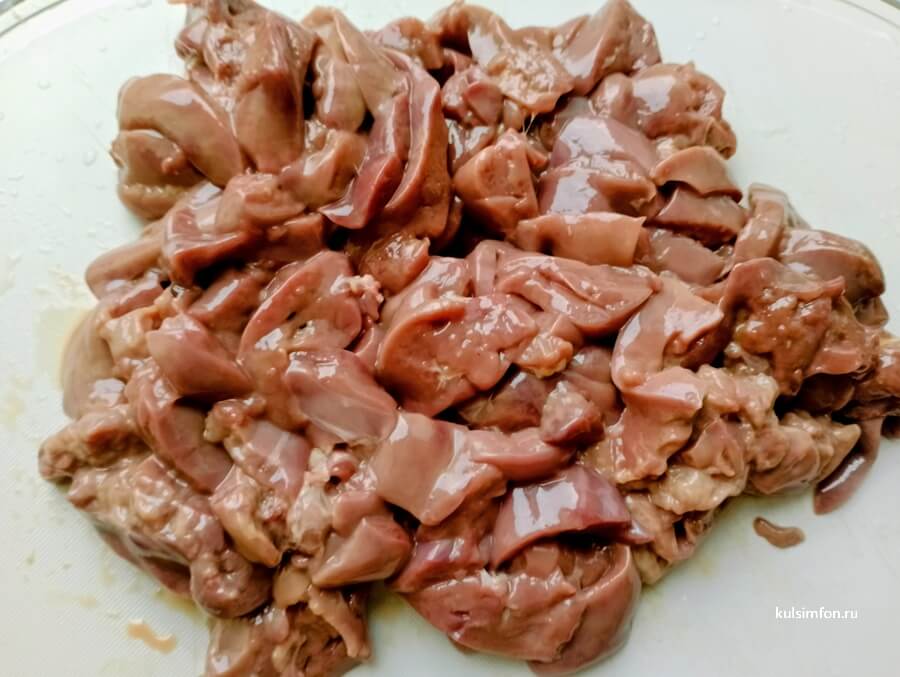 - Промываем печень, обсушиваем и нарезаем небольшими кусочками.