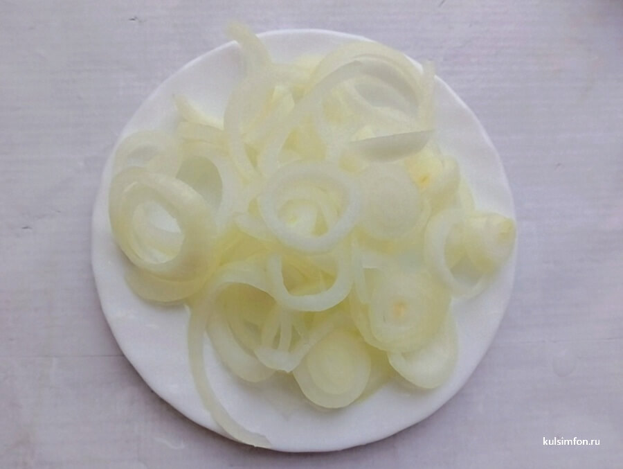 - Очищаем лук, промываем и нарезаем тонкими кольцами.