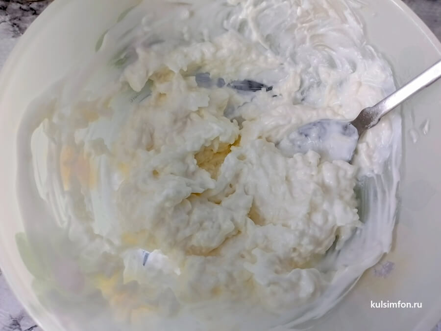 - Сулугуни натереть на мелкой терке и смешать со сметаной.