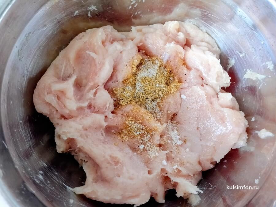 - Измельчить филе в блендере до состояния фарша. Переложить в глубокую миску, добавить соль и специи.