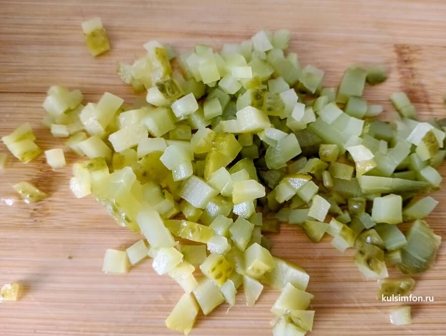 - Маринованные огурцы нарезать мелкими кубиками.
