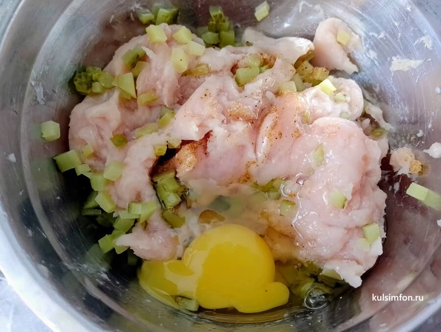 - Добавить огурцы к фаршу, вбить яйцо. Тщательно перемешать массу до однородности.