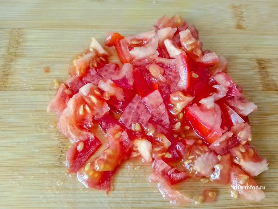 - Помидор вымыть и нарезать брусочками.