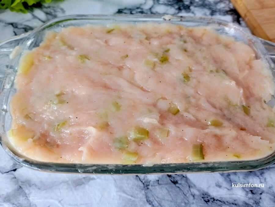 - Выложить куриный фарш в форму для запекания, хорошо утрамбовать, чтобы внутри не было пустот.
