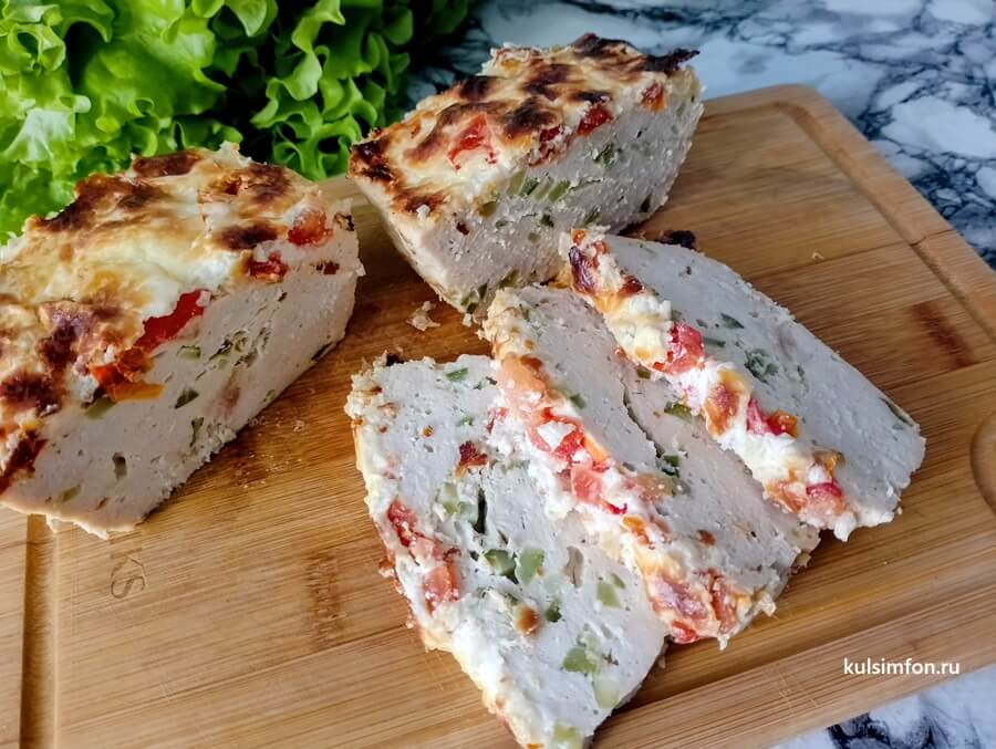- Готовый куриный кекс немного остудить, аккуратно вынуть из формы и нарезать ломтиками.