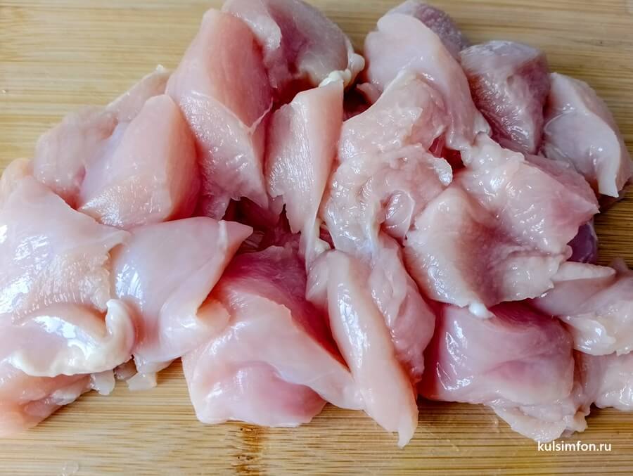 - Куриное филе промыть, обсушить бумажным полотенцем и нарезать ломтиками.