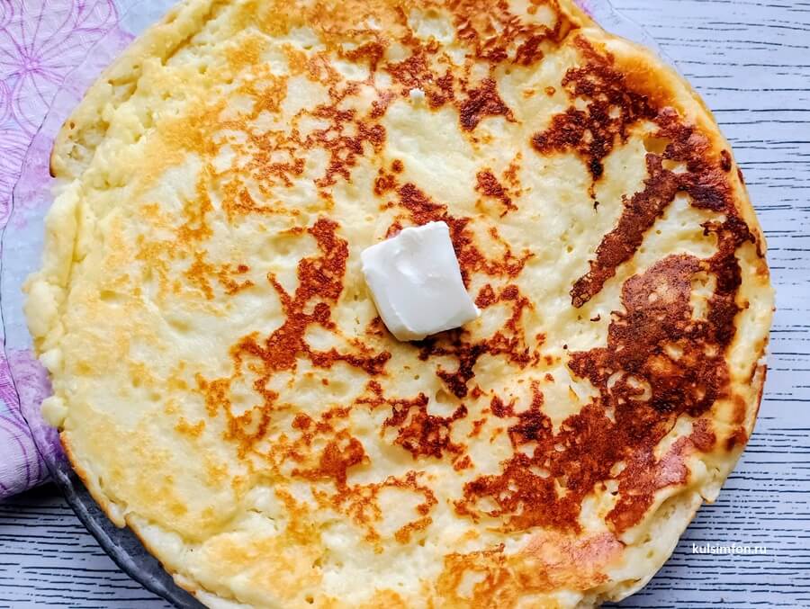 - Готовую лепешку смазать сливочным маслом, нарезать порционно и подавать горячей.