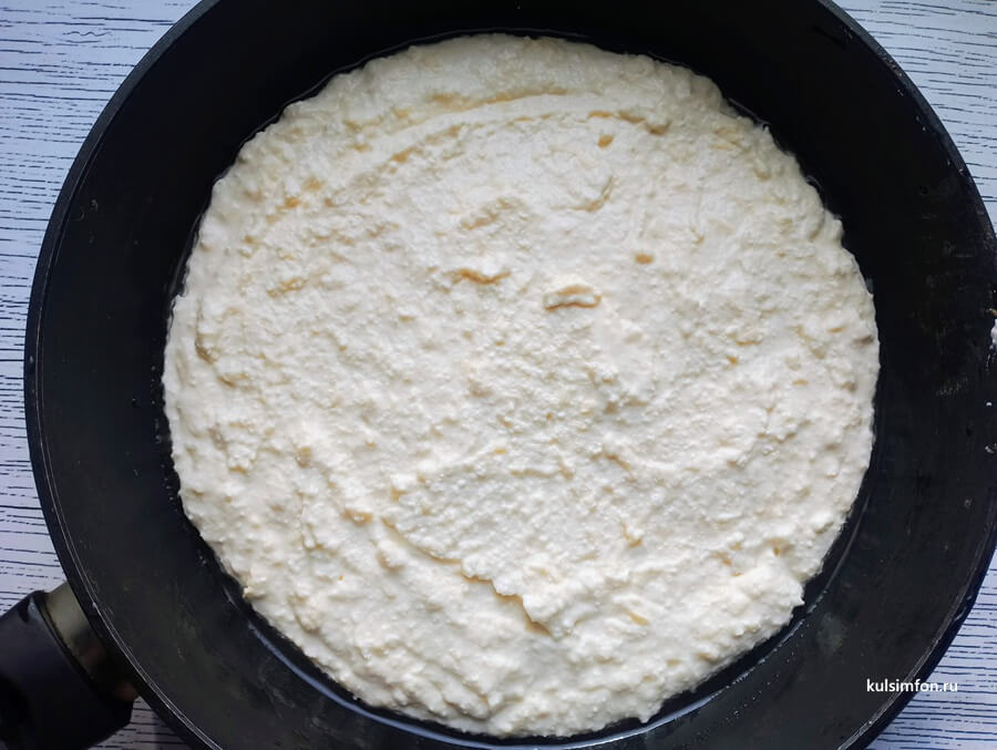 - Сковороду смазать растительным маслом, выложить тесто и разровнять лопаткой, формируя лепешку одинаковой толщины.