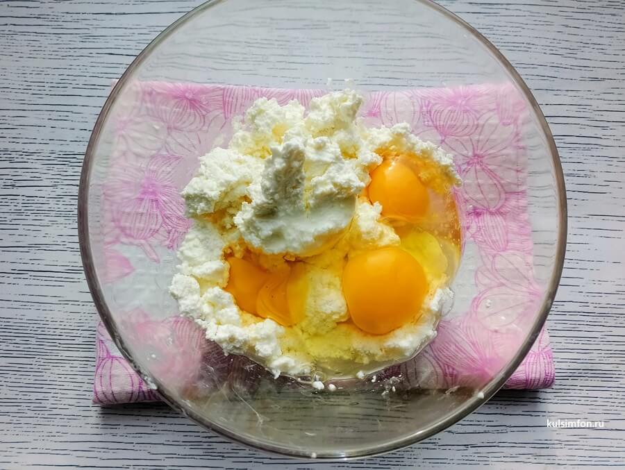 - Творог выложить в глубокую миску и тщательно размять ложкой до однородности.
