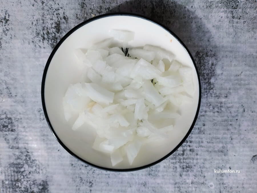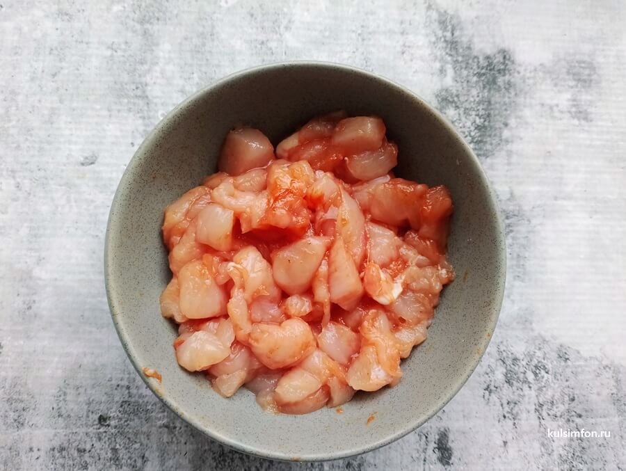 - Куриное филе нарезать небольшими кусочками, посолить, добавить томатную пасту и приправу. Хорошо перемешать.