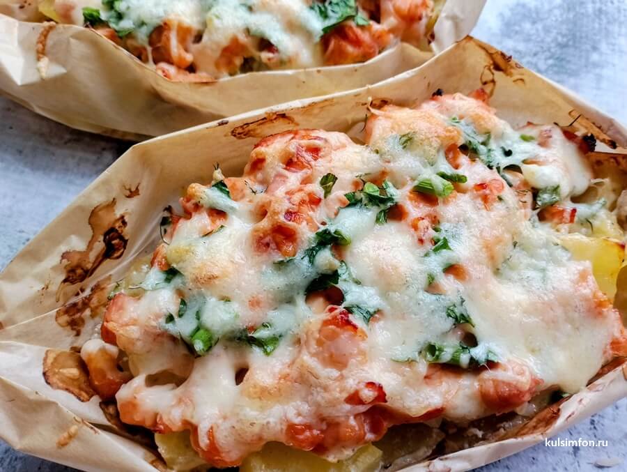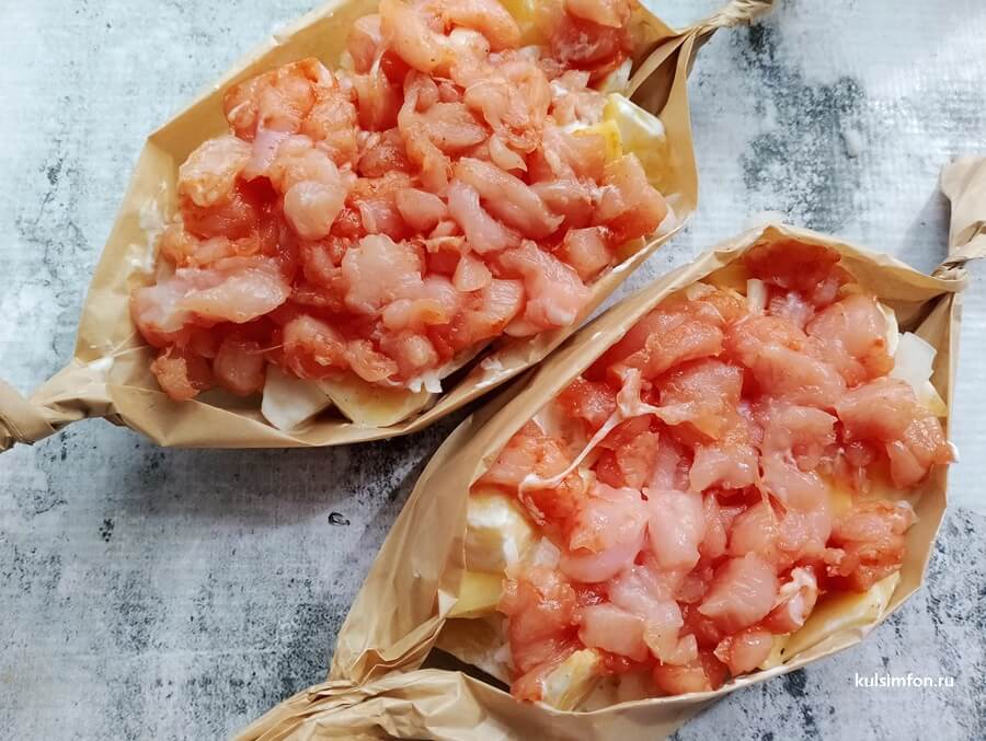 - Готовое блюдо можно подавать прямо в пергаментных лодочках — это удобно и эффектно. Картофель и курица при таком способе приготовления сохраняют нежность и насыщенный вкус. Приятного аппетита!