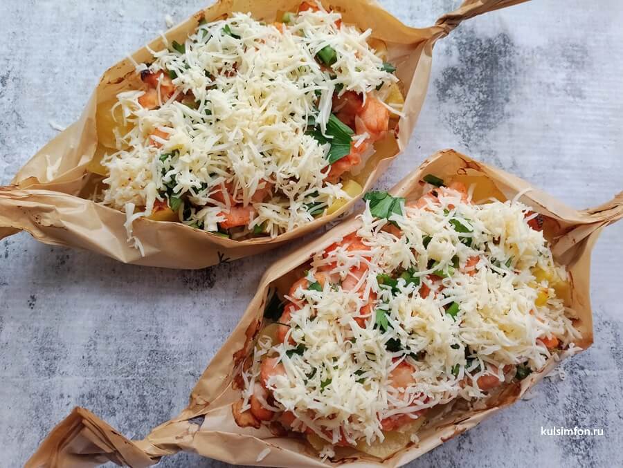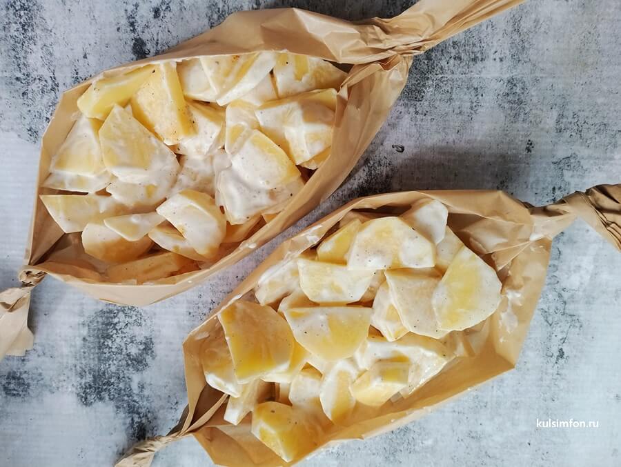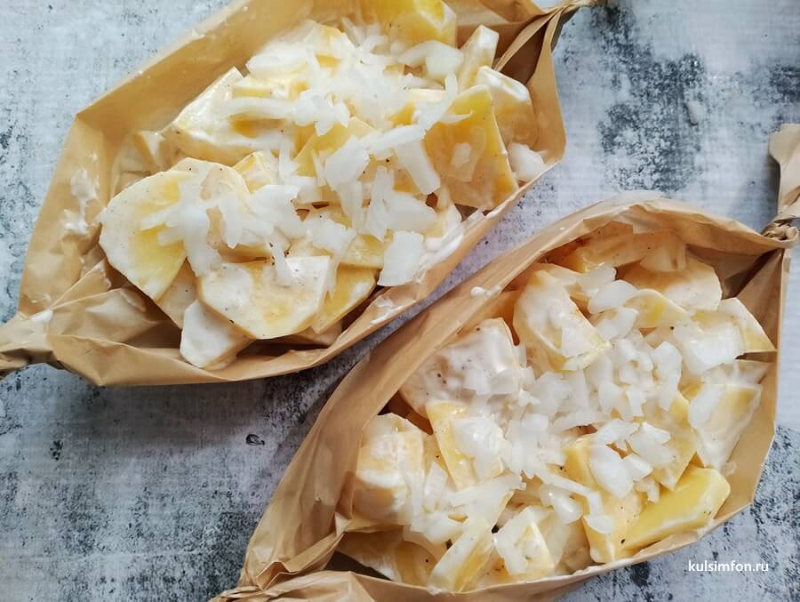 - Из листов пергамента сформировать лодочки. Выложить в них картофель в сметане.