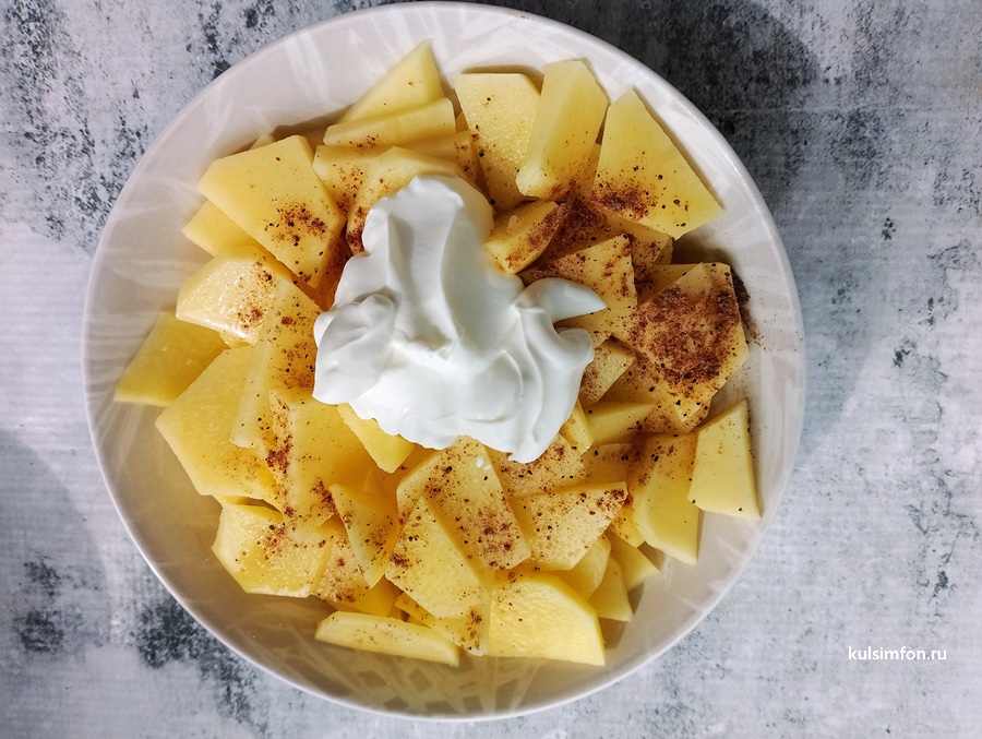 - Добавить к картофелю сметану и тщательно перемешать, чтобы соус распределился равномерно.