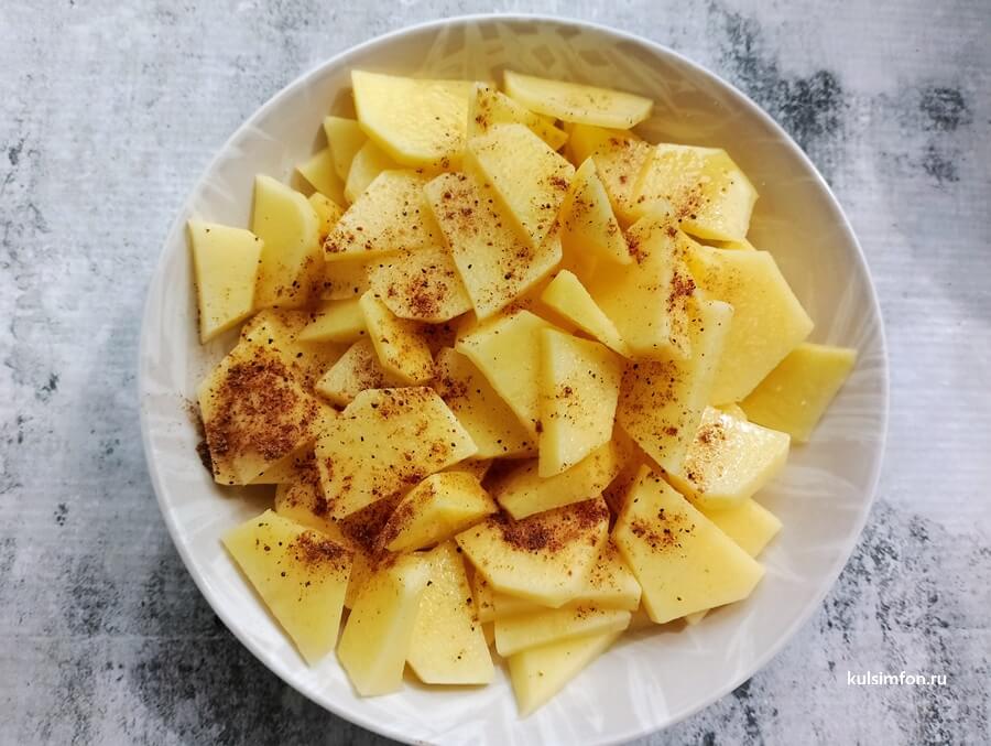 - Картофель очистить и нарезать тонкими ломтиками, приправить и слегка посолить.
