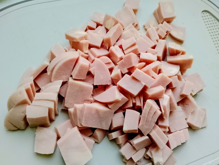 - Нарежьте ветчину небольшими тонкими ломтиками.
