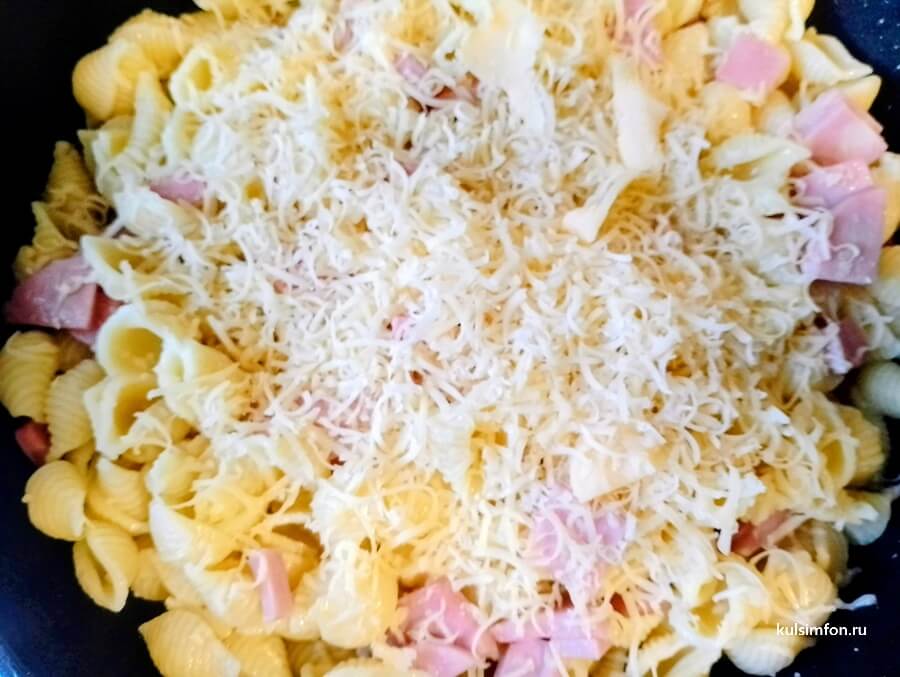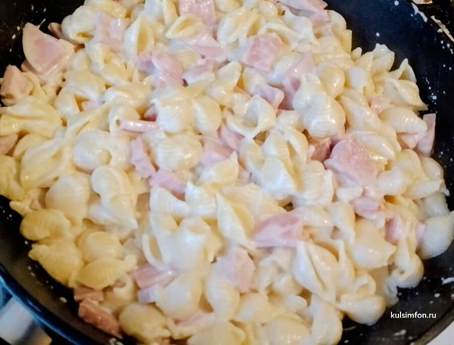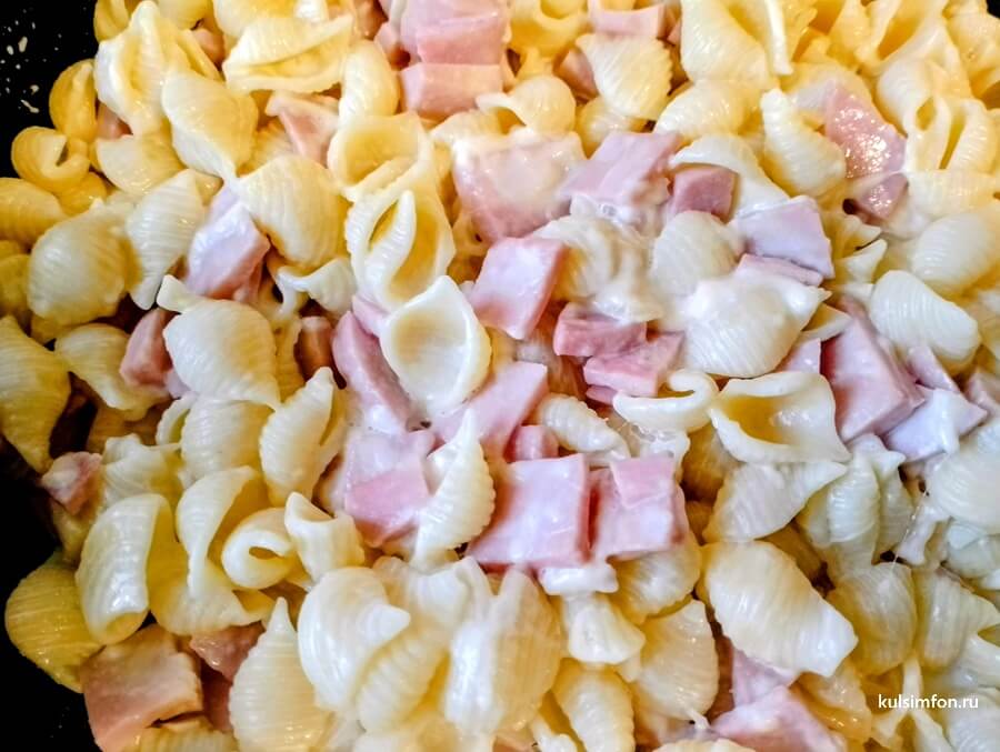 - Слейте воду с готовых макарон и выложите их в сковороду к ветчине. Перемешайте.