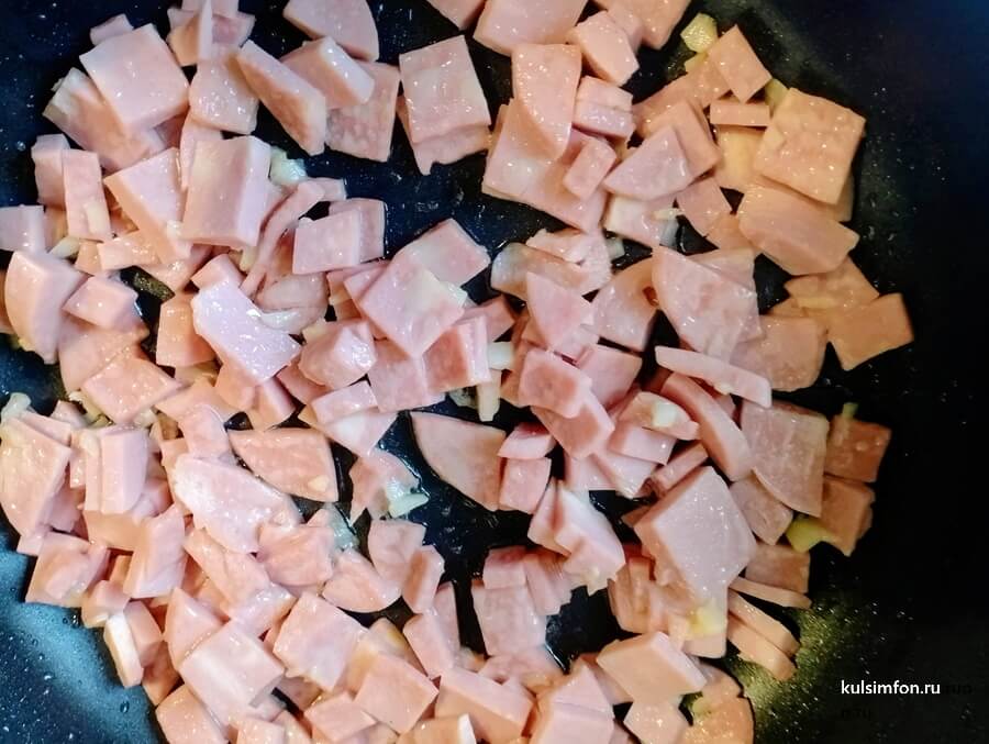 - Переложите ветчину в сковороду к чесноку и обжарьте 2–3 минуты на слабом огне, периодически помешивая.