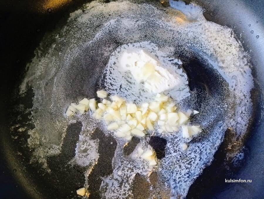 - В сковороде растопите сливочное масло, добавьте чеснок и слегка прогрейте его, не допуская подгорания.