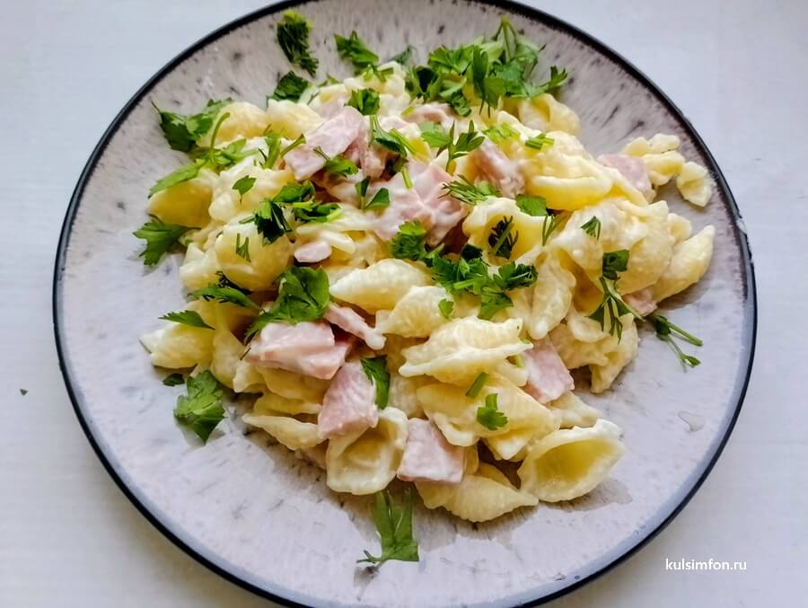 - Подавайте макароны с ветчиной и сыром горячими, присыпав зеленью. Это блюдо особенно вкусно в сочетании со свежими овощами или легким салатом.