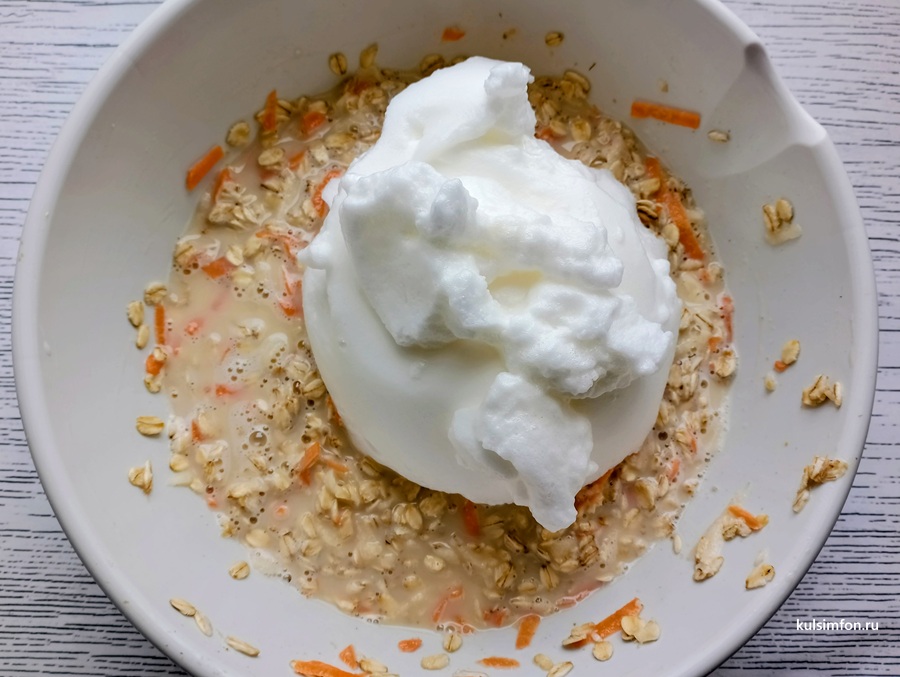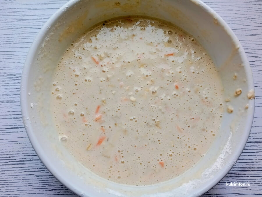 - Добавить натертые яблоко и морковь в овсяную смесь, перемешать.