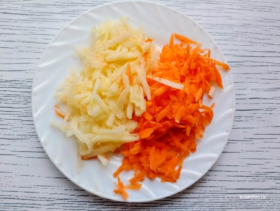 - Яблоко и морковь очистить и натереть на крупной терке.