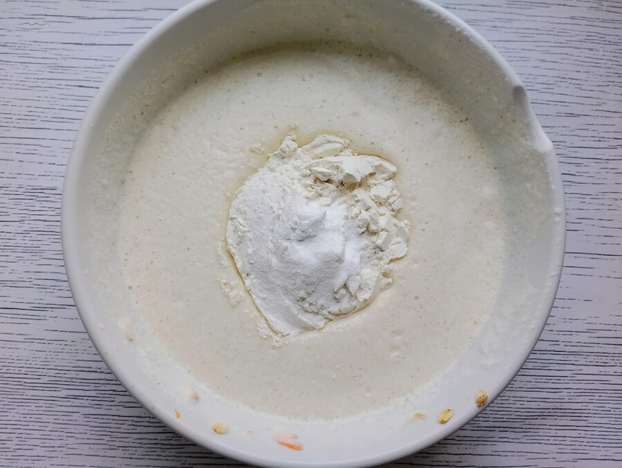 - Просеять муку вместе с разрыхлителем и постепенно ввести в тесто.