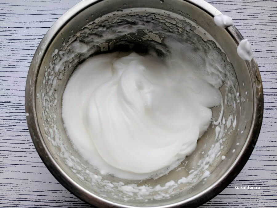 - Яйца вымыть, аккуратно отделить белки от желтков. Белки взбить в крепкую пену. Для лучшего результата можно добавить щепотку соли.