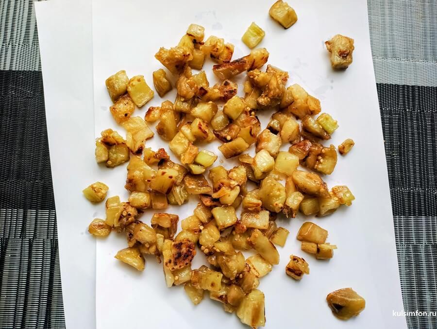 - Готовые кусочки баклажана выложить на бумагу. Подождать, чтобы впиталось лишнее масло.