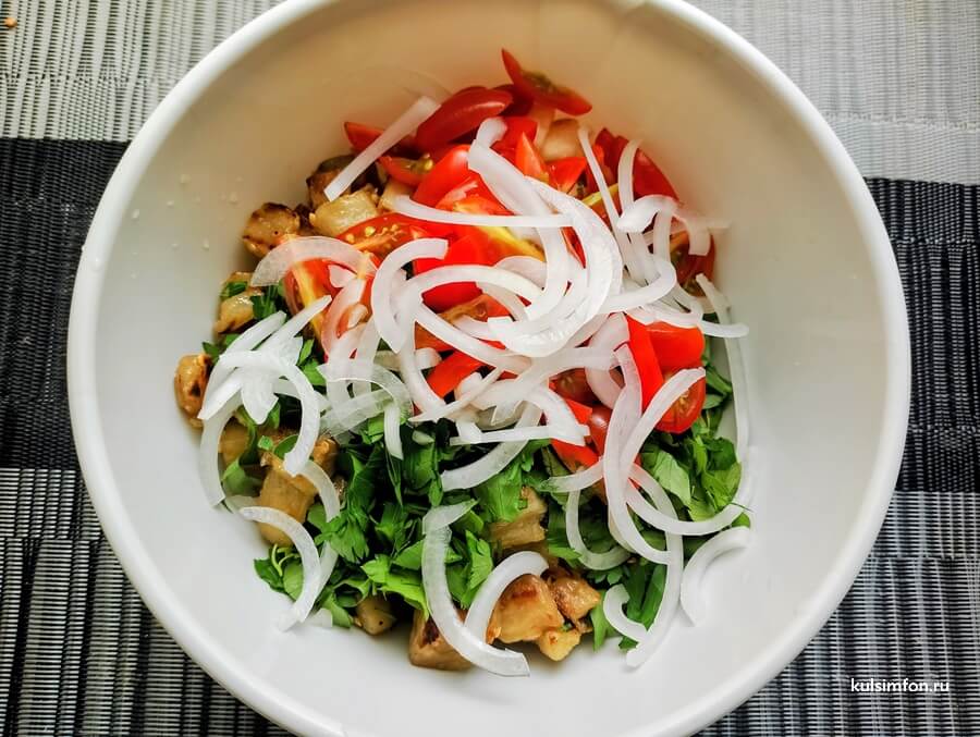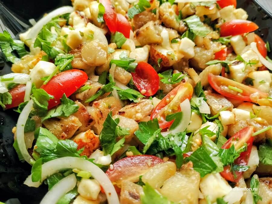 Салат с жареными баклажанами хорош как в теплом, так и в холодном виде. Его можно подать как самостоятельное блюдо или дополнение к мясу и рыбе. Приятного аппетита!