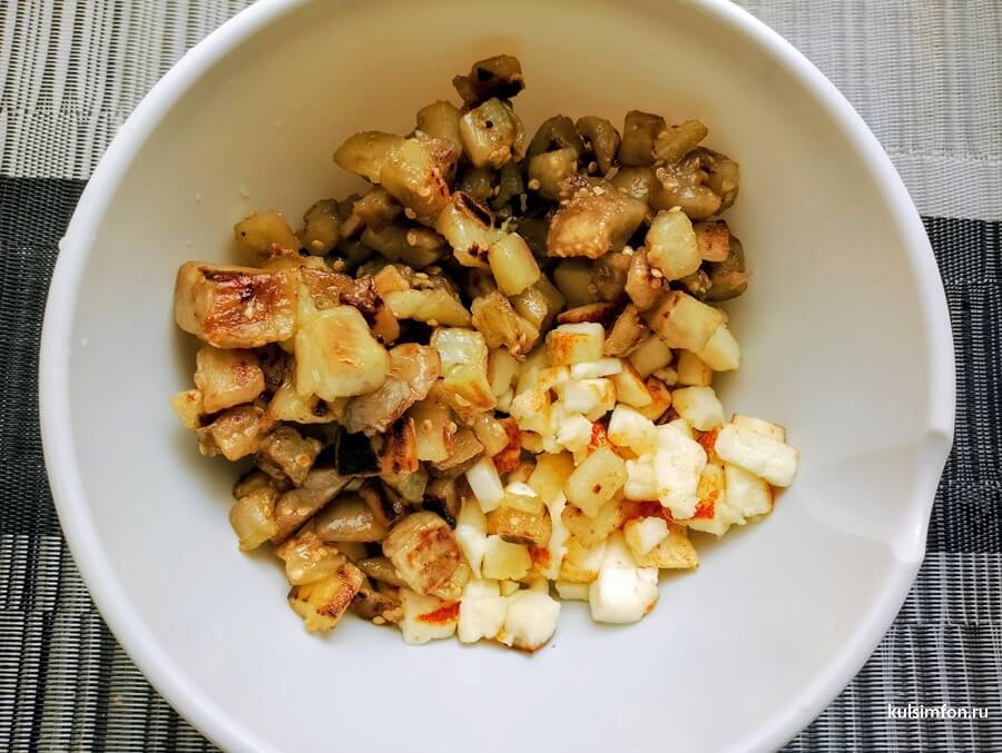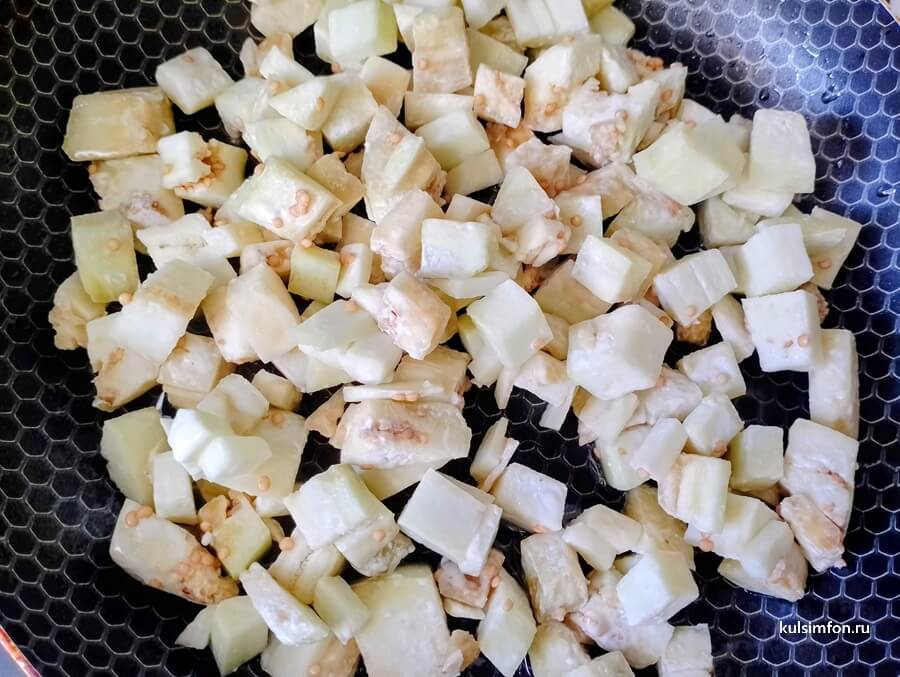 - Обжарить их в масле до готовности. Необходимо также постоянно перемешивать кусочки баклажана в масле, чтобы со всех сторон сформировалась хрустящая корочка.