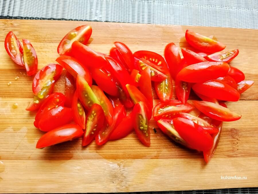 - Томаты черри разрезать на четвертинки и выложить в салат.
