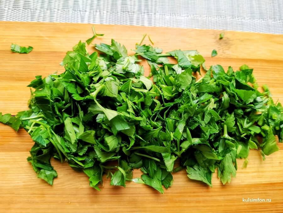 - Лук нарезать тонкими полукольцами и добавить к остальным ингредиентам.