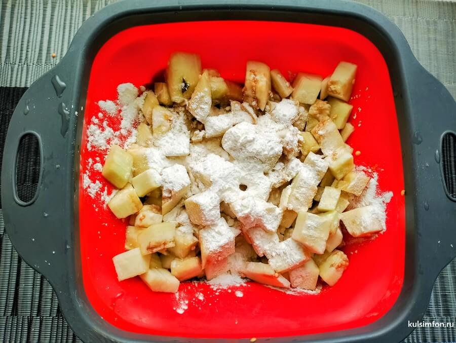 - Пересыпать равномерно кусочки баклажана кукурузным крахмалом.