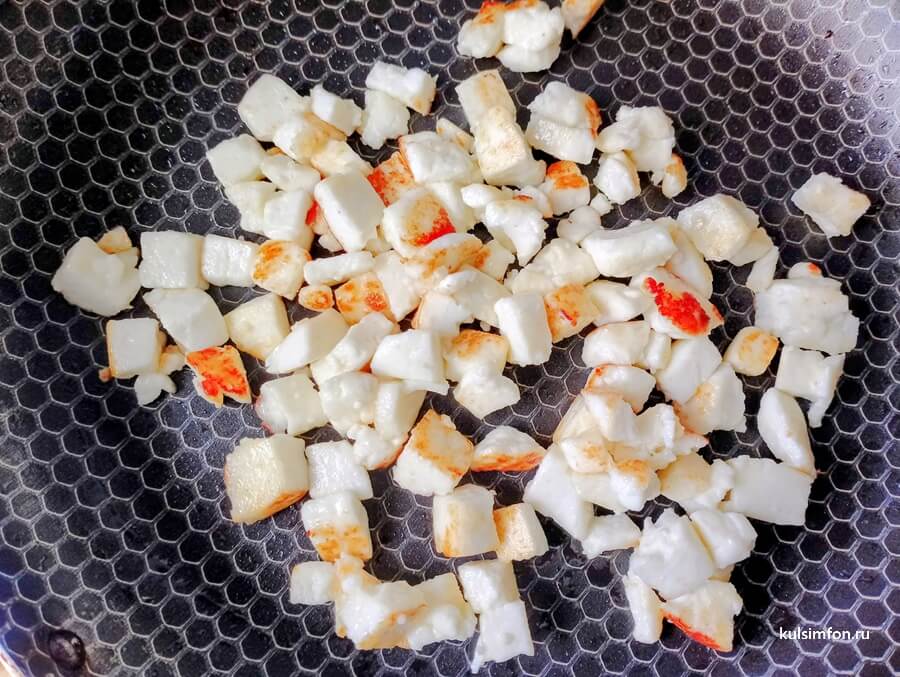 - Обжарить сырные кусочки на сухой сковороде. Для равномерной обжарки необходимо постоянно перемешивать кусочки в процессе приготовления.