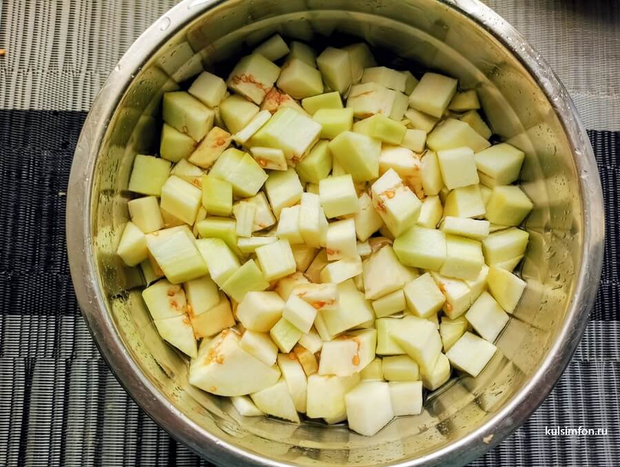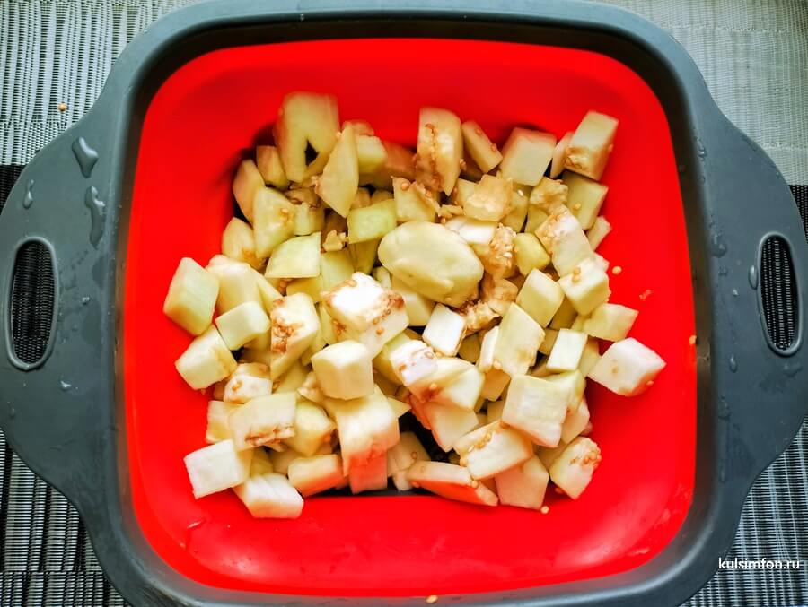 - Переложить подготовленные кусочки баклажана в глубокую емкость, хорошо посолить, залить водой и оставить на 15 минут.