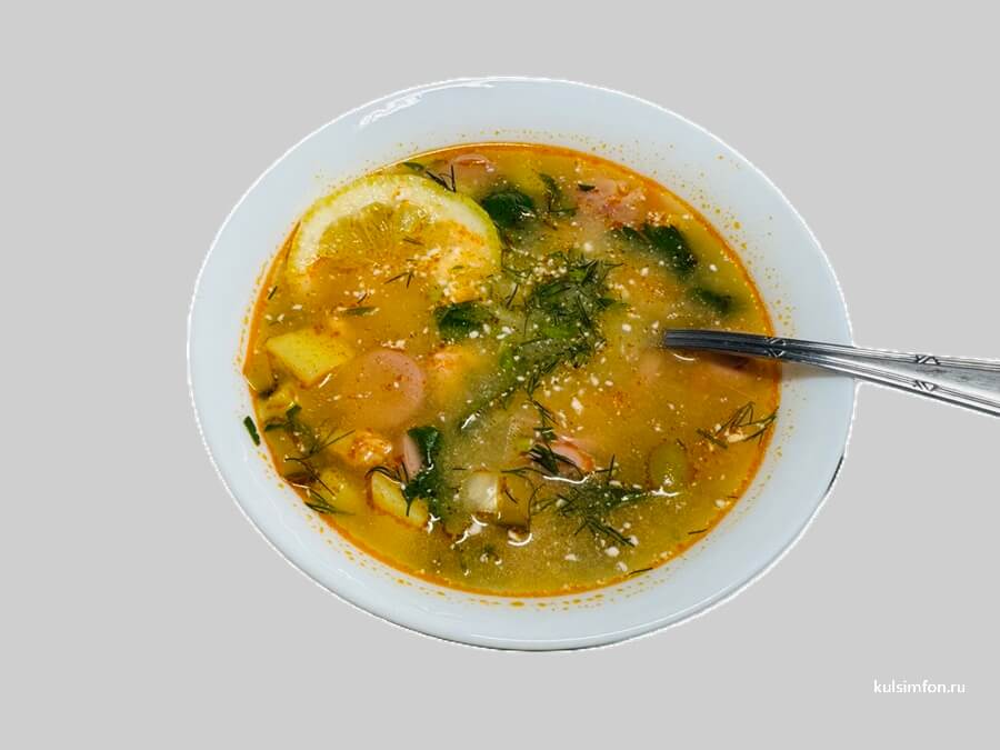 Солянка с жареной курицей и сосисками: рецепт по шагам